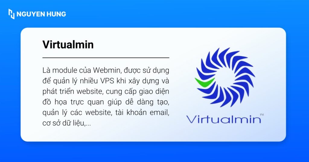 Virtualmin là một module mã nguồn mở miễn phí của Webmin, được sử dụng để quản lý nhiều VPS khi xây dựng và phát triển website. Nhờ tích hợp trên nền tảng Webmin, Virtualmin cung cấp giao diện đồ họa trực quan giúp quản trị viên dễ dàng tạo, quản lý các website, tài khoản email, cơ sở dữ liệu, DNS, FTP,… trên nhiều máy chủ ảo chỉ với vài thao tác đơn giản. Đây là giải pháp tối ưu, phù hợp cho cá nhân hoặc doanh nghiệp muốn tự chủ trong quản lý hệ thống web hosting, đồng thời tiết kiệm chi phí và dễ dàng mở rộng các tính năng nâng cao khi cần thiết.