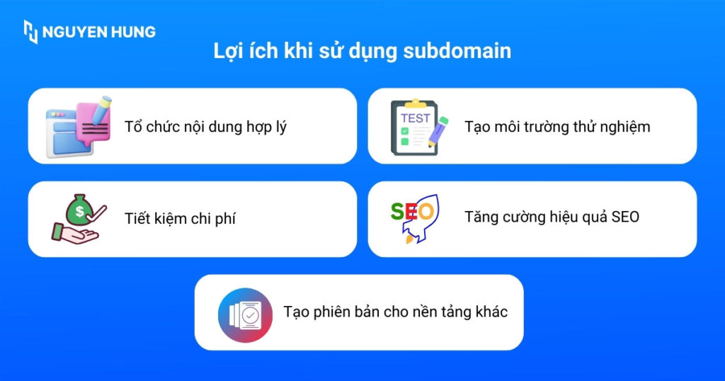 - Lợi ích sử dụng subdomain: Tổ chức nội dung, tiết kiệm chi phí, tạo môi trường thử nghiệm, tăng cường SEO, tạo phiên bản cho nền tảng khác.
