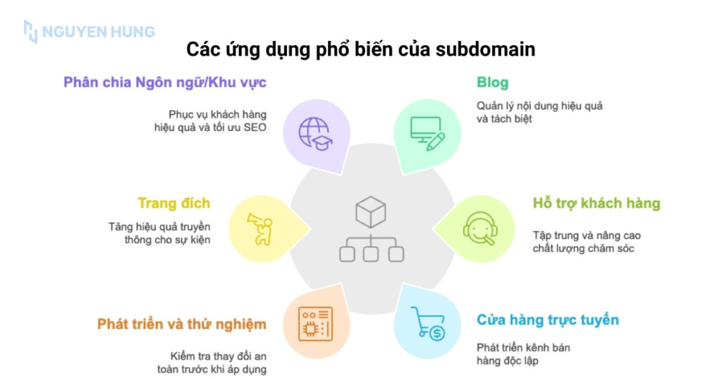 - Các ứng dụng phổ biến của subdomain: Được ứng dụng rộng rãi để tạo blog riêng, trang hỗ trợ khách hàng, cửa hàng trực tuyến, môi trường phát triển/thử nghiệm, và phân vùng website theo ngôn ngữ/khu vực.