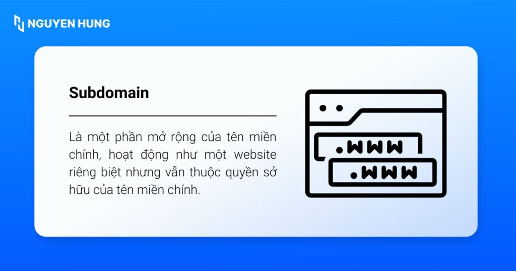 - Khái niệm Subdomain: Là một phần mở rộng của tên miền chính (Ví dụ: blog.tenmiencuaban.com), hoạt động như website độc lập, được tạo ra từ tên miền chính.