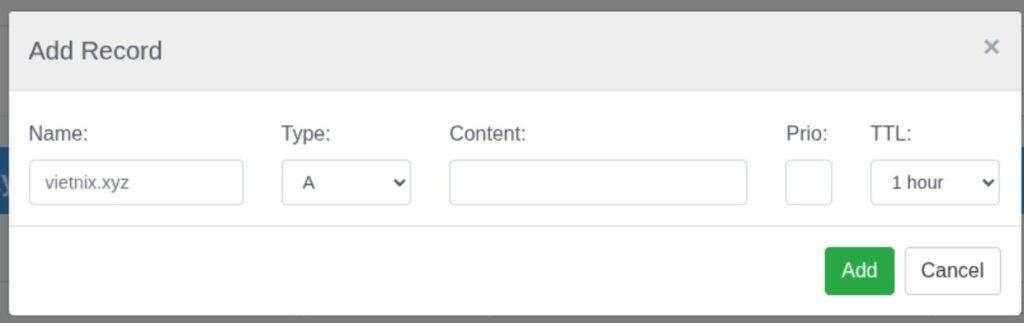 . Lưu ý: Một số nhà cung cấp yêu cầu nhập đầy đủ tên subdomain, hãy kiểm tra hướng dẫn của họ. - Value/Content: Dán địa chỉ IP của hosting mà bạn đã chuẩn bị ở trên vào đây.