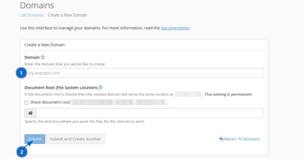 . - Document Root (Thư mục gốc): cPanel sẽ tự động điền một đường dẫn thư mục, ví dụ