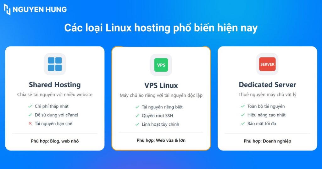 - Phân biệt được 3 loại Linux Hosting phổ biến (Shared Hosting, VPS Linux, Dedicated Server Linux) và biết loại nào phù hợp với quy mô, nhu cầu website của bạn.