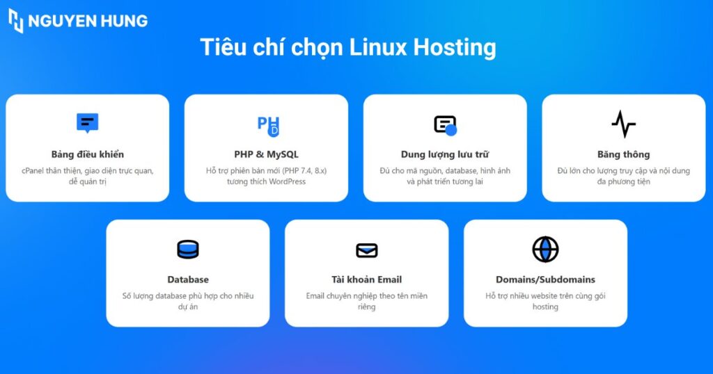 - Nắm được các yếu tố kỹ thuật quan trọng cần xem xét khi chọn Linux Hosting (bảng điều khiển cPanel, phiên bản PHP/MySQL, dung lượng, băng thông) và các tiêu chí để chọn nhà cung cấp uy tín (hỗ trợ khách hàng, uptime, bảo mật, chính sách hoàn tiền).