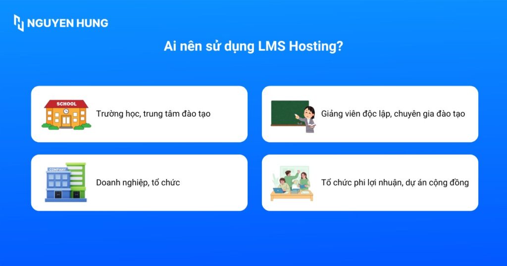 - Đối tượng sử dụng: LMS Hosting phù hợp với mọi cá nhân và tổ chức muốn triển khai hệ thống eLearning, bao gồm các trường học, trung tâm đào tạo, các doanh nghiệp dùng cho đào tạo nội bộ, các giảng viên độc lập bán khóa học và các tổ chức phi lợi nhuận.