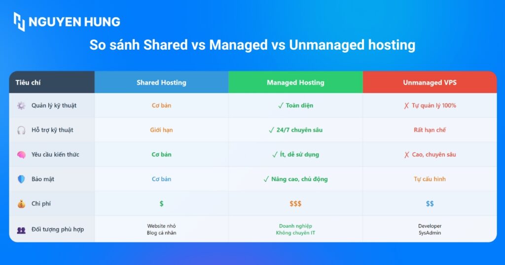 | Tiêu chí | Shared Hosting | Managed Hosting (Chung) | Unmanaged VPS/Dedicated Server |