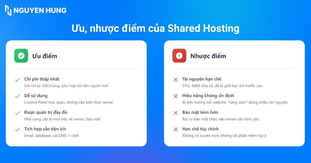 • Nắm vững ưu điểm (chi phí thấp, dễ sử dụng, môi trường được quản lý) và nhược điểm (giới hạn hiệu năng, rủi ro bảo mật chéo, hạn chế tùy chỉnh, khó khăn troubleshoot sâu) của Shared Hosting từ góc nhìn kỹ thuật.