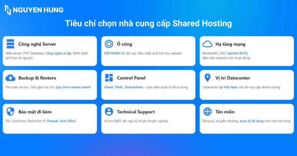 • Có bộ tiêu chí kỹ thuật chi tiết (công nghệ server, minh bạch tài nguyên, ổ cứng SSD NVMe, backup, hỗ trợ kỹ thuật…) để chọn nhà cung cấp Shared Hosting uy tín.