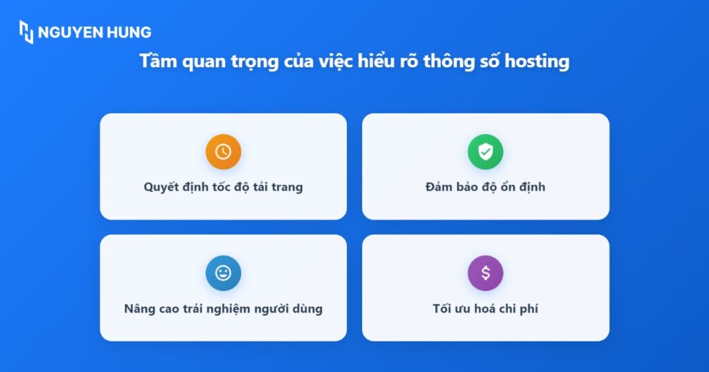 - Tầm quan trọng của thông số hosting: Giúp đảm bảo tốc độ tải trang, độ ổn định, trải nghiệm người dùng và tối ưu chi phí.