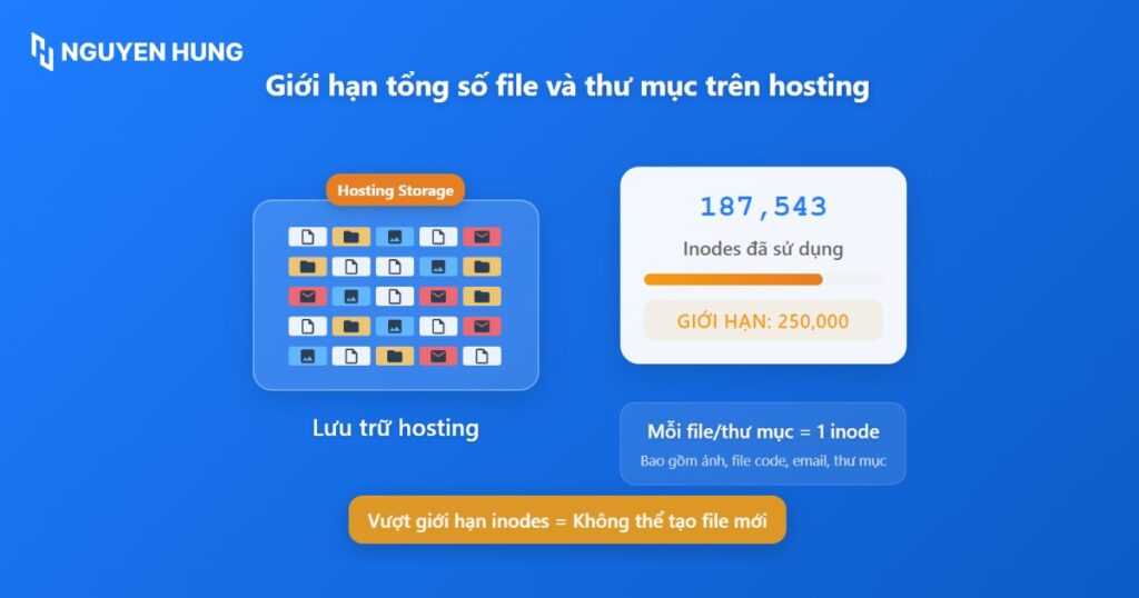 Inodes đại diện cho tổng số lượng file và thư mục có thể lưu trữ trên hosting của bạn. Mỗi file (ảnh, file mã nguồn, email…) và mỗi thư mục đều được tính là 1 inode.