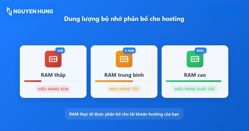 RAM (Random Access Memory) là bộ nhớ tạm, nơi lưu trữ các dữ liệu và tiến trình đang được CPU xử lý. Dữ liệu trong RAM sẽ bị mất khi máy chủ tắt hoặc khởi động lại, vì vậy RAM chỉ được dùng để xử lý các tác vụ tức thời. RAM càng nhiều, hosting có thể xử lý đồng thời càng nhiều tác vụ và phục vụ được nhiều người truy cập cùng một lúc mà không bị chậm hay gặp lỗi không thể truy cập khi website có traffic tăng đột biến.