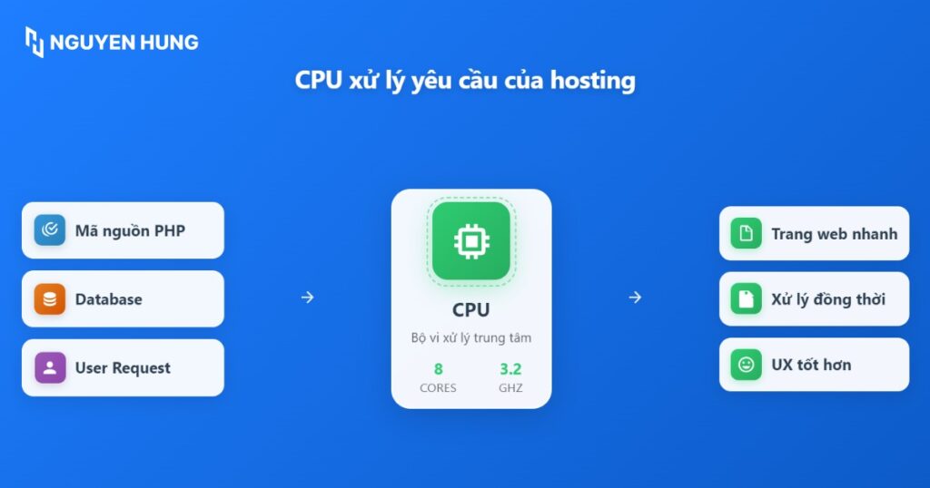 CPU (Central Processing Unit) là nơi chịu trách nhiệm xử lý tất cả các yêu cầu, từ việc thực thi mã nguồn PHP, chạy các truy vấn đến cơ sở dữ liệu, cho đến xử lý các tác vụ nền. Thông số CPU của hosting càng mạnh (nhiều nhân/core, xung nhịp cao) thì thời gian xử lý yêu cầu càng nhanh, giúp website tải nhanh hơn, đặc biệt quan trọng với các website phức tạp như trang thương mại điện tử có nhiều bộ lọc sản phẩm.