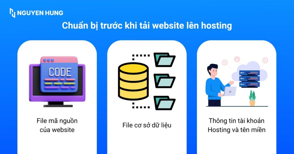 - Chuẩn bị trước khi tải website lên hosting: Cần chuẩn bị ba yếu tố chính là file mã nguồn nén, file cơ sở dữ liệu và thông tin tài khoản hosting.