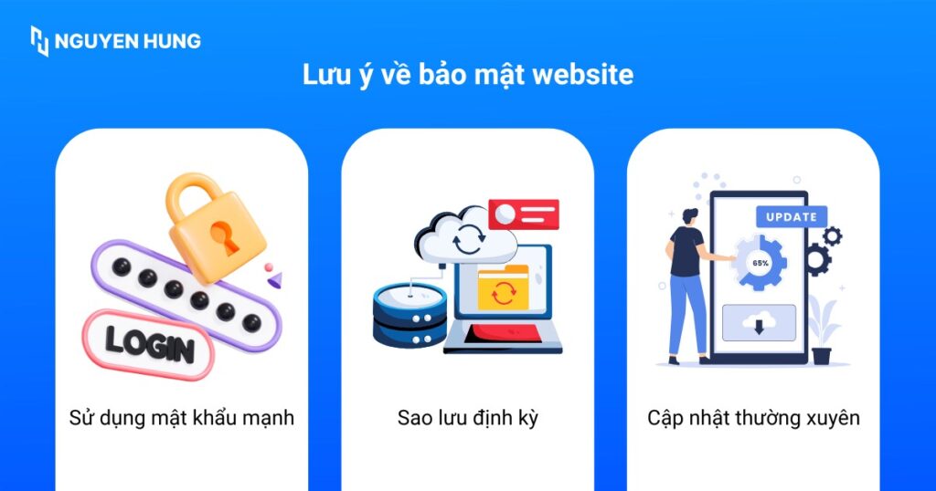 Ngoài các bước cơ bản như dùng mật khẩu mạnh, cập nhật thường xuyên và sao lưu dữ liệu, bạn nên kích hoạt SSL, sử dụng các plugin bảo mật (nếu dùng CMS) và hạn chế cài đặt các theme/plugin không rõ nguồn gốc.