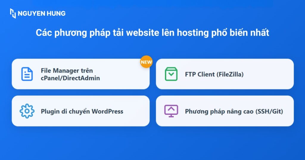- Các phương pháp tải phổ biến: Gồm nhiều cách như sử dụng File Manager, FTP Client, plugin di chuyển cho WordPress hoặc SSH cho người dùng kỹ thuật.
