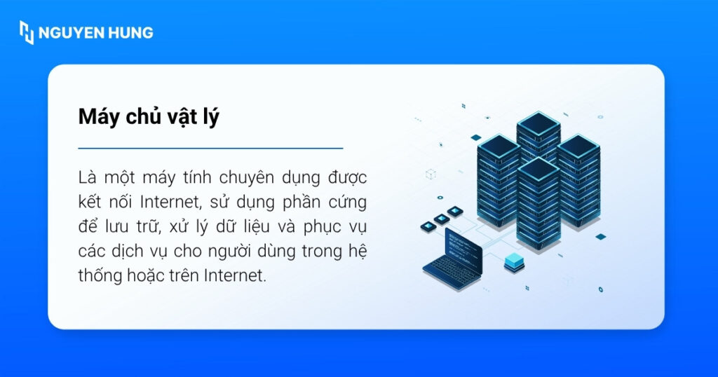 - Khái niệm máy chủ vật lý: Là một máy tính chuyên dụng với phần cứng độc lập, không chia sẻ tài nguyên, được thiết kế để lưu trữ, xử lý dữ liệu và hoạt động liên tục 24/7.