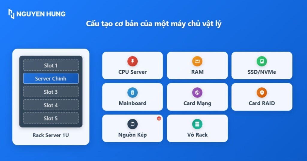Máy chủ vật lý về cơ bản có cấu tạo tương tự như một máy tính chuyên dụng, nhưng với các linh kiện có hiệu năng cao hơn và được tối ưu hóa cho hoạt động liên tục.
