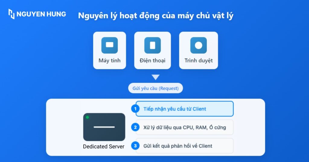 - Xử lý và phản hồi: Máy chủ vật lý tiếp nhận yêu cầu, xử lý dữ liệu theo yêu cầu đó (thông qua CPU, RAM và ổ cứng), sau đó gửi kết quả hoặc thông tin phản hồi trở lại cho Client.