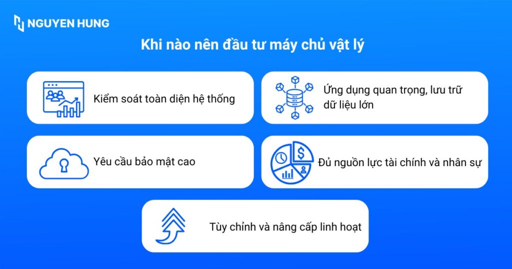 Đầu tư máy chủ vật lý là lựa chọn phù hợp khi doanh nghiệp cần kiểm soát toàn diện và tối ưu hóa hệ thống công nghệ thông tin của mình. Các trường hợp nên đầu tư bao gồm: