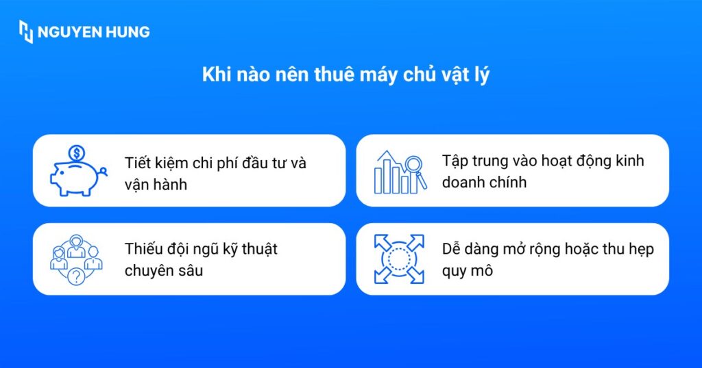Thuê máy chủ vật lý là giải pháp lý tưởng cho doanh nghiệp muốn tiết kiệm chi phí và giảm gánh nặng quản lý hạ tầng công nghệ. Các trường hợp nên thuê bao gồm: