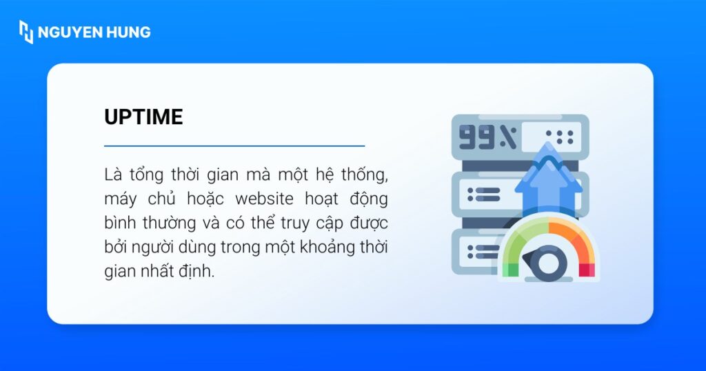 - Khái niệm uptime: Là tổng thời gian mà một hệ thống hoạt động liên tục và có thể truy cập được, thường được tính bằng tỷ lệ phần trăm.