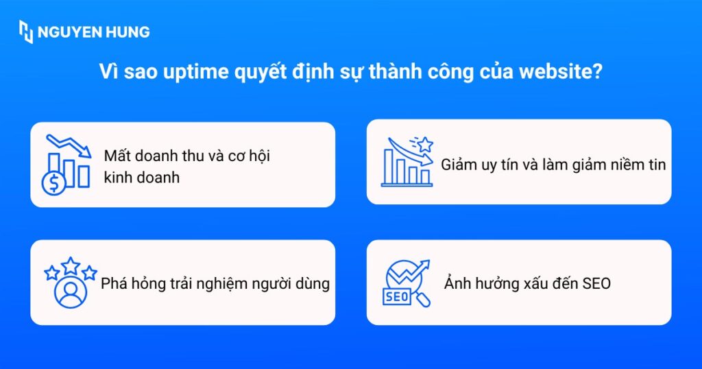 - Tầm quan trọng của uptime: Có vai trò sống còn đối với doanh nghiệp, vì downtime gây mất doanh thu, giảm uy tín thương hiệu và ảnh hưởng tiêu cực đến thứ hạng SEO.