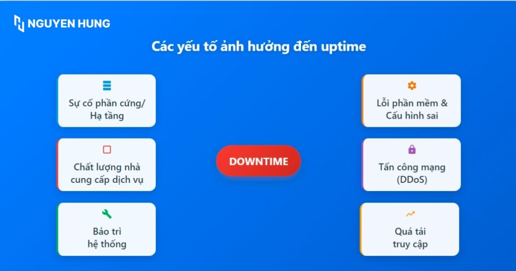 - Những yếu tố ảnh hưởng đến uptime: Bị ảnh hưởng bởi nhiều yếu tố như sự cố phần cứng, lỗi phần mềm, tấn công mạng, quá tải truy cập, và chất lượng của nhà cung cấp dịch vụ.