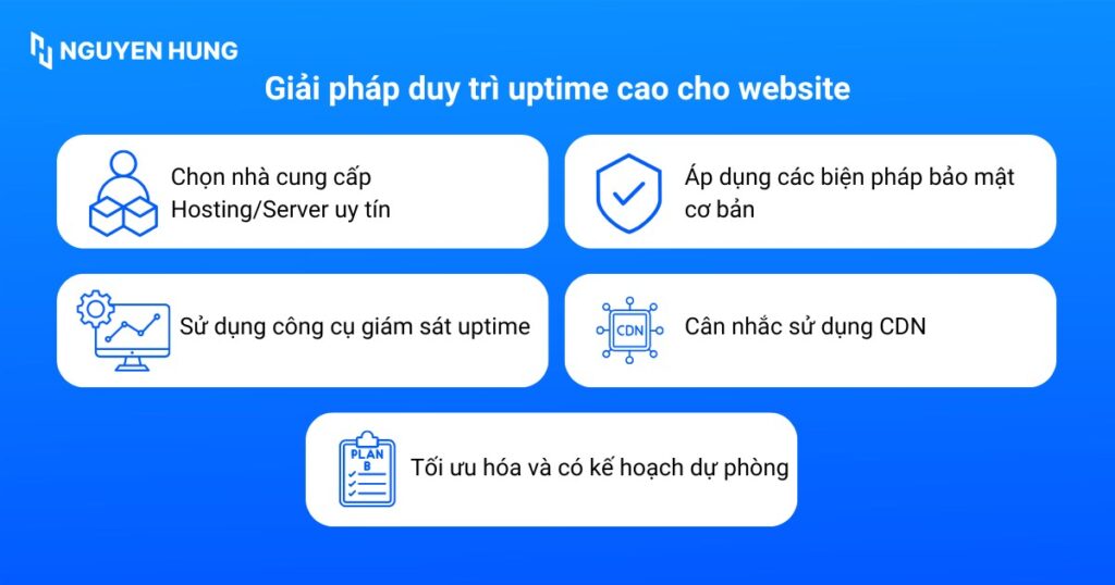 Việc duy trì uptime cao cho website không chỉ là trách nhiệm của nhà cung cấp dịch vụ lưu trữ mà còn phụ thuộc vào cách bạn quản lý và tối ưu hóa các yếu tố liên quan. Dưới đây là những giải pháp thực tế giúp website của bạn luôn sẵn sàng hoạt động: