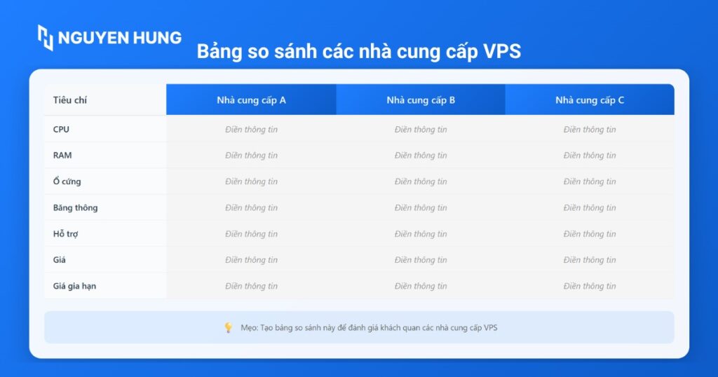 Hãy tạo một bảng so sánh đơn giản các nhà cung cấp bạn quan tâm dựa trên các tiêu chí này.