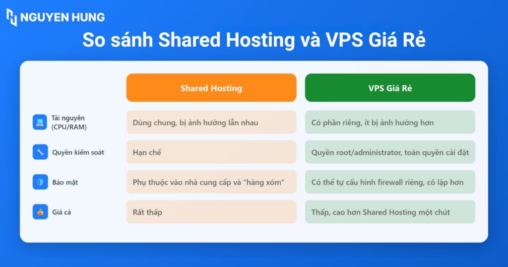 Sự khác biệt chính giữa Shared Hosting và VPS giá rẻ nằm ở tài nguyên và quyền kiểm soát: