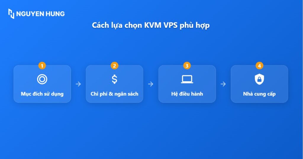 - Cách lựa chọn KVM VPS phù hợp: Dựa trên mục đích sử dụng, chi phí/ngân sách, hệ điều hành, nhà cung cấp dịch vụ.