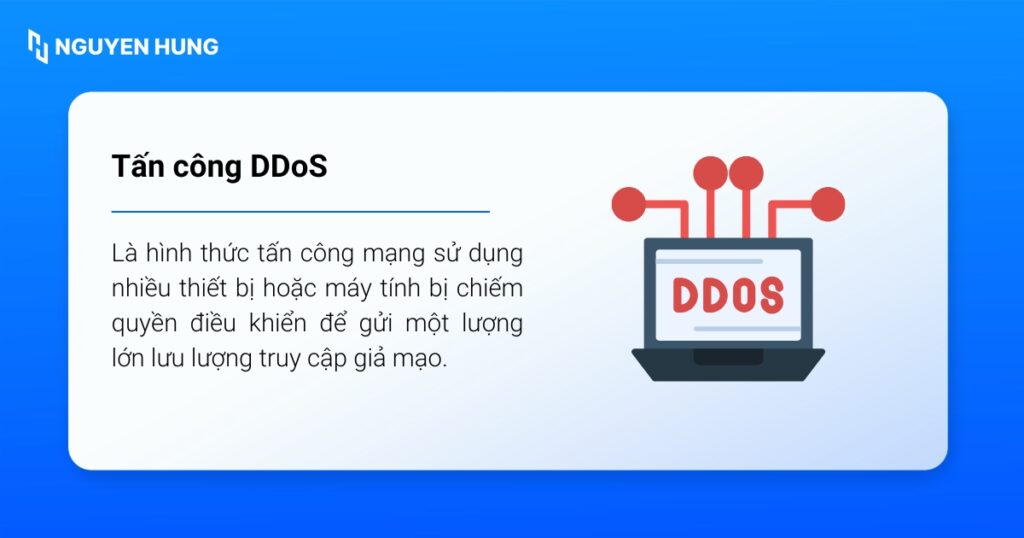 Tấn công DDoS là hình thức tấn công mạng sử dụng nhiều thiết bị hoặc máy tính bị chiếm quyền điều khiển (thường qua mạng botnet) để gửi một lượng lớn lưu lượng truy cập giả mạo hoặc yêu cầu không hợp lệ đến một máy chủ, website hoặc dịch vụ mạng mục tiêu cùng lúc.