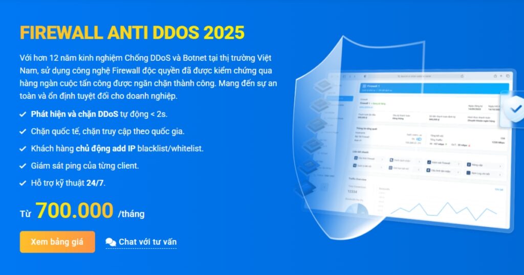 Firewall Anti DDoS của Vietnix là giải pháp bảo vệ chuyên sâu và toàn diện giúp phát hiện và ngăn chặn các cuộc tấn công DDoS tự động trong dưới 2 giây. Dịch vụ hoạt động trên nền tảng hạ tầng độc quyền của Vietnix với công nghệ phòng thủ đa lớp từ lọc gói tin, kiểm soát truy cập theo quốc gia, giới hạn tần suất truy cập IP đến phân tích chữ ký botnet và hành vi, đảm bảo chặn đứng lưu lượng độc hại hiệu quả mà không làm gián đoạn trải nghiệm người dùng thật.