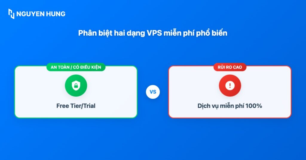 - Dịch vụ miễn phí 100%: Đây là các dịch vụ được cung cấp bởi các cá nhân, nhóm nhỏ hoặc các công ty ít tên tuổi trên thị trường, quảng cáo VPS hoàn toàn miễn phí, không giới hạn thời gian hay yêu cầu thanh toán. Đây là loại miễn phí mà bạn cần cảnh giác cao độ nhất vì rủi ro đi kèm là cực kỳ lớn.