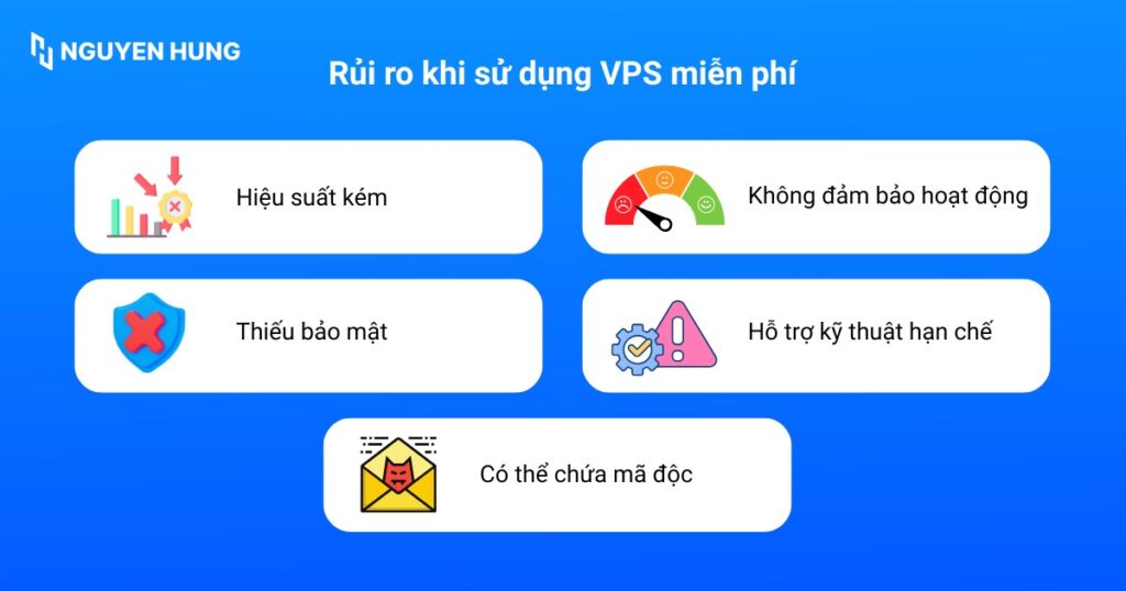 Việc sử dụng VPS miễn phí, đặc biệt từ các nguồn không rõ ràng, tiềm ẩn nhiều nguy cơ ảnh hưởng đến hiệu quả hoạt động và an toàn dữ liệu của bạn.