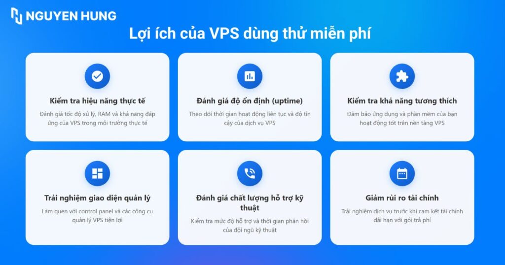- Hiểu được lợi ích của việc dùng thử VPS miễn phí (kiểm tra hiệu năng, độ ổn định, tương thích, hỗ trợ kỹ thuật, giảm rủi ro tài chính) trước khi quyết định mua.