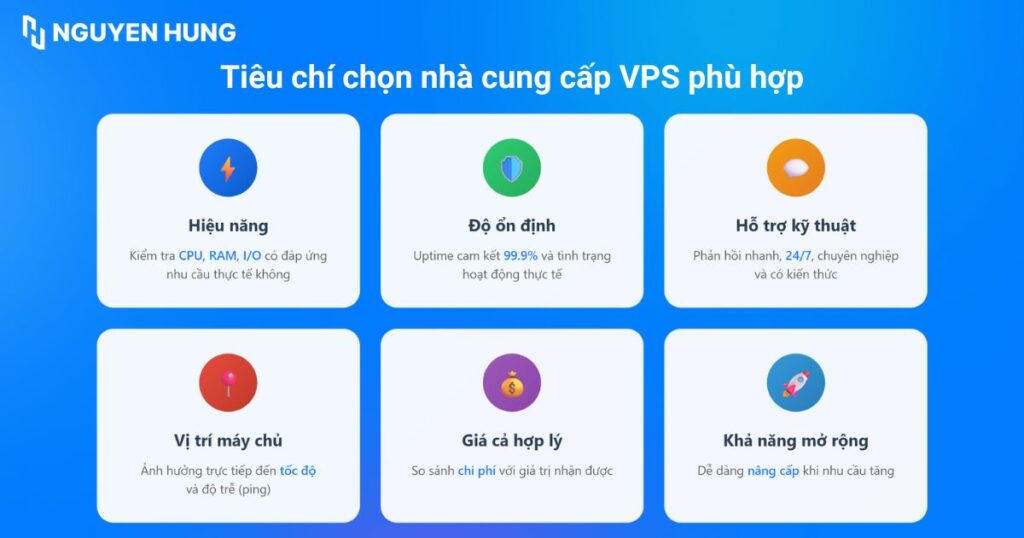 Tập trung kiểm tra hiệu năng thực tế (CPU, RAM, tốc độ ổ cứng I/O, tốc độ mạng), độ ổn định, giao diện quản lý, và chất lượng hỗ trợ kỹ thuật. Đọc kỹ điều khoản dùng thử và chính sách sau dùng thử.