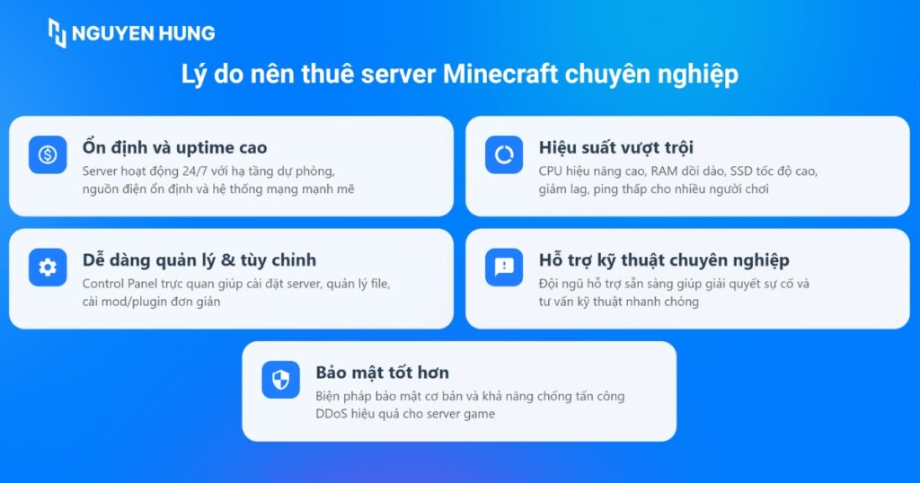 Việc thuê một server Minecraft chuyên nghiệp mang lại nhiều lợi ích đáng kể so với việc tự vận hành: