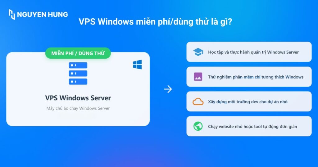- Dễ tiếp cận & trải nghiệm: Cơ hội làm quen với Windows Server và giao diện quản lý của nhà cung cấp.