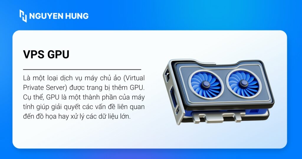 VPS GPU là máy chủ ảo (VPS) được trang bị thêm card đồ họa (GPU). GPU vượt trội hơn CPU ở khả năng xử lý song song hàng ngàn tác vụ nhỏ, mang lại hiệu năng cao cho các ứng dụng chuyên biệt.