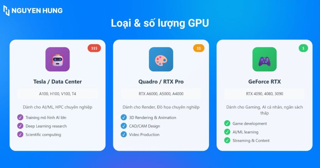 - Loại: NVIDIA Tesla/Data Center (A100, H100) cho AI/HPC; NVIDIA Quadro/RTX Pro (A4000/A6000) cho đồ họa chuyên nghiệp; NVIDIA GeForce RTX (3090, 4090) cho cá nhân/ngân sách thấp.