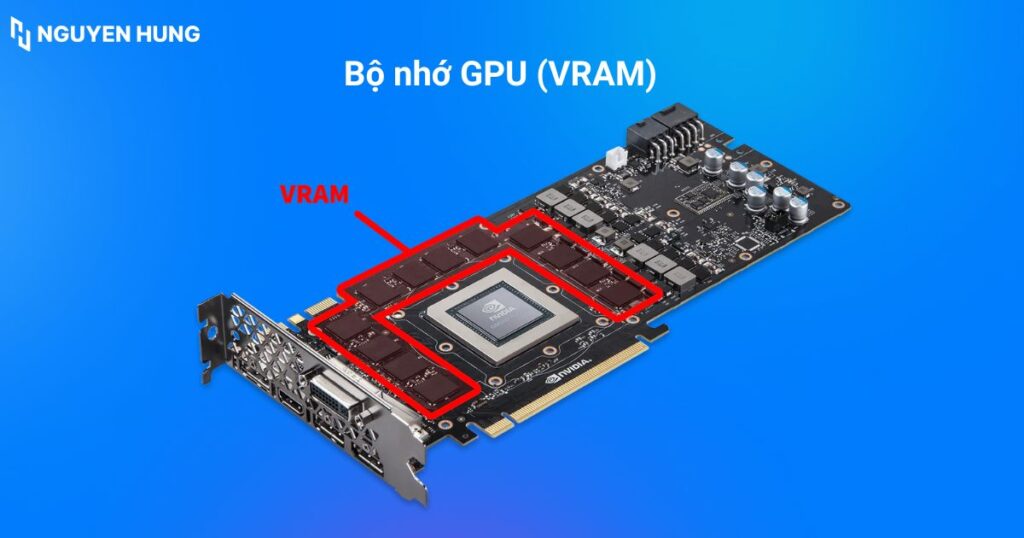 VRAM (Video RAM) là bộ nhớ tốc độ cao được tích hợp trực tiếp trên card đồ họa. Nó dùng để lưu trữ dữ liệu mà GPU đang tích cực xử lý, như dataset trong AI, textures trong render, hoặc frame buffer.