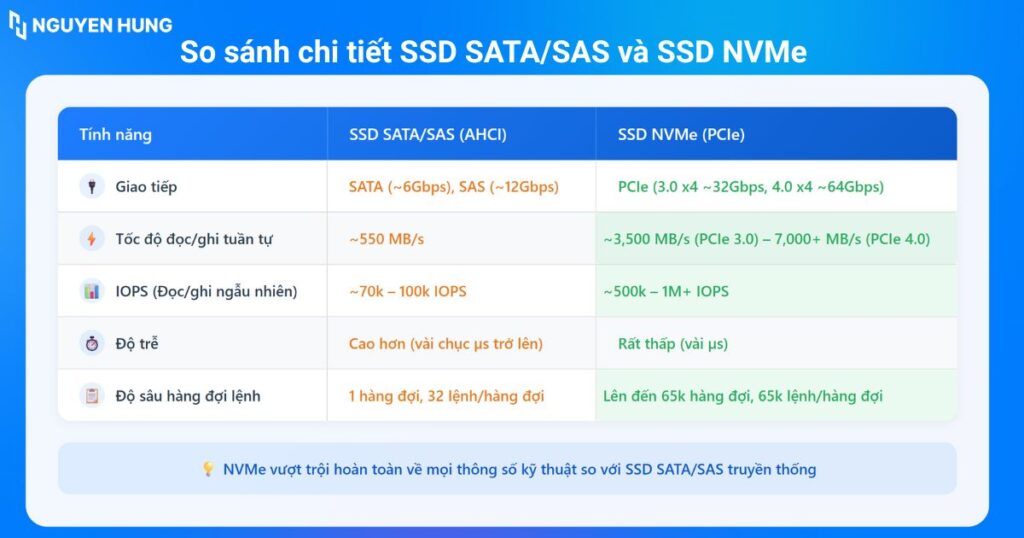 - Giao tiếp: NVMe (PCIe, ví dụ 32-64 Gbps) nhanh hơn nhiều so với SATA/SAS.