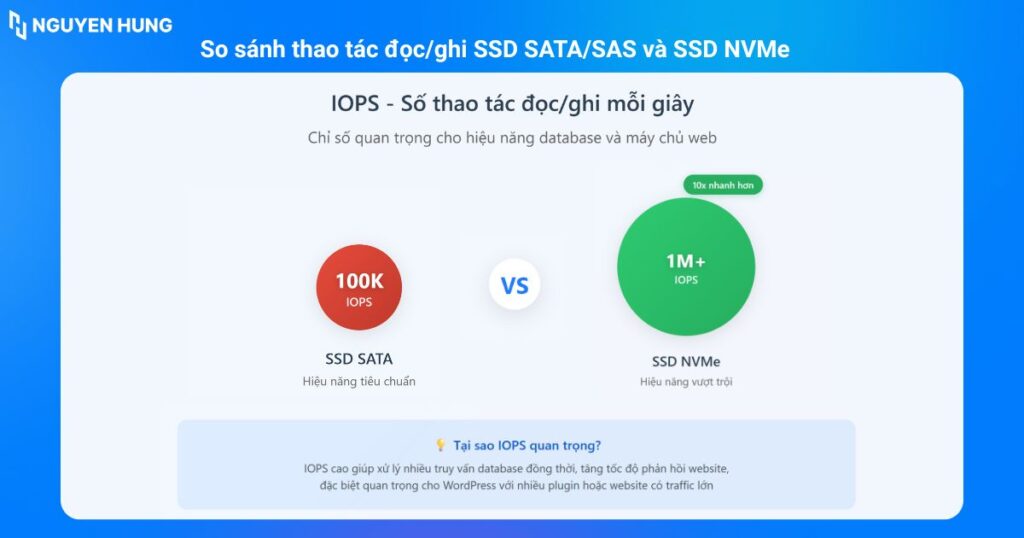 - Sự vượt trội của NVMe về IOPS là rất lớn, đặc biệt quan trọng cho các tác vụ đòi hỏi truy cập ngẫu nhiên nhanh.