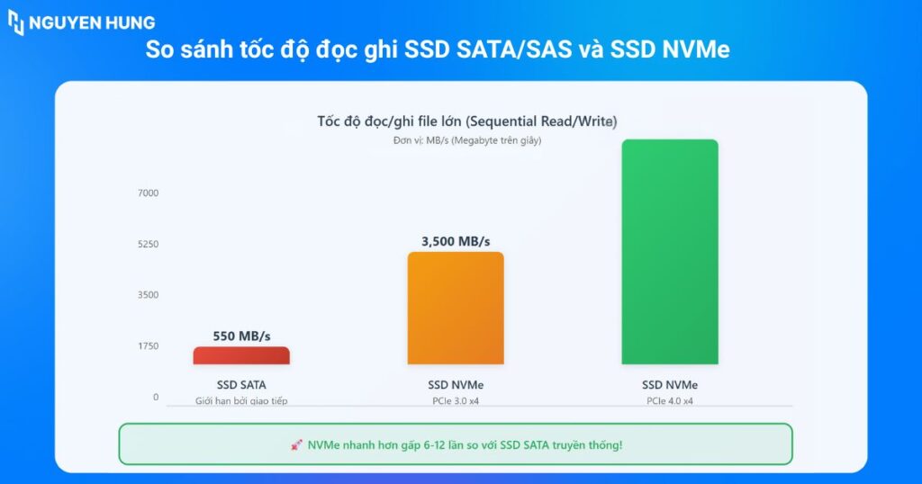 Tốc độ đọc/ghi tuần tự | ~550 MB/s | ~3,500 MB/s (PCIe 3.0) – 7,000+ MB/s (PCIe 4.0) |